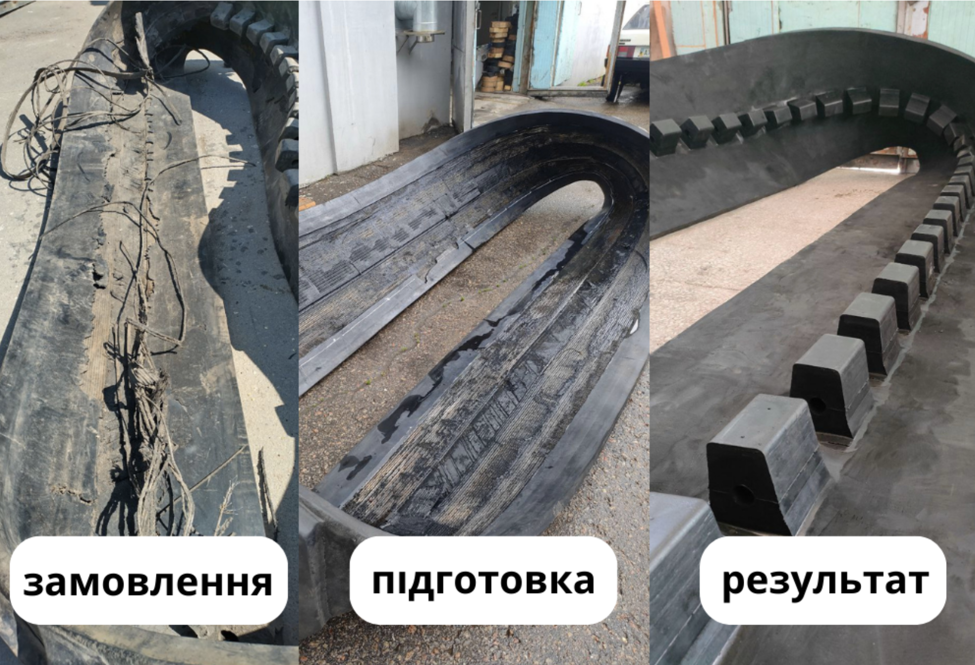 Або навпаки – ушкоджується шар гуми, що контактує з катками та колесами. Наприклад, якщо комбайн або трактор експлуатувався на кам'янистих ґрунтах, часто пересувався своїм ходом по гравійним дорогам – гума дуже швидко «з'їдається» дрібними камінчиками, що потрапляють між колесами та гусеницею. Прагнучи уникнути зайвих витрат, власники техніки John Deere, Claas, CAT, Challenger та ін. зверталися із запитами щодо можливості усунення таких пошкоджень.