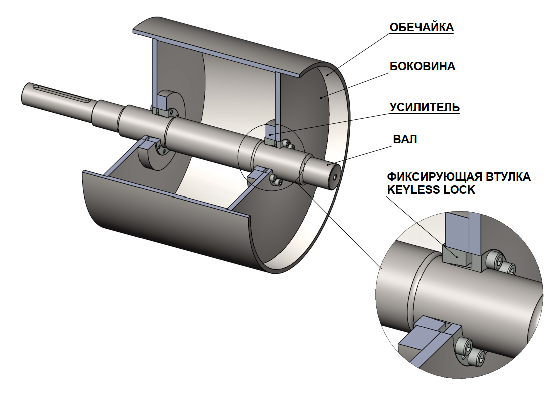 - Барабаны на разжимных втулках (бесшпоночное соединнение) -оснащенные разжимными втулками, представляют собой конструкцию с бесшпоночным соединением. Это упрощенное соединение обеспечивает конструктивную легкость за счет отсутствия шпоночного элемента между валом и обечайкой. Передача крутящего момента осуществляется благодаря силам трения между сопрягаемыми поверхностями "вал-разжимная втулка-обечайка". Величина передаваемого крутящего момента зависит от конструкции разжимной втулки, диаметра вала и других параметров. Это решение является средним по цене.