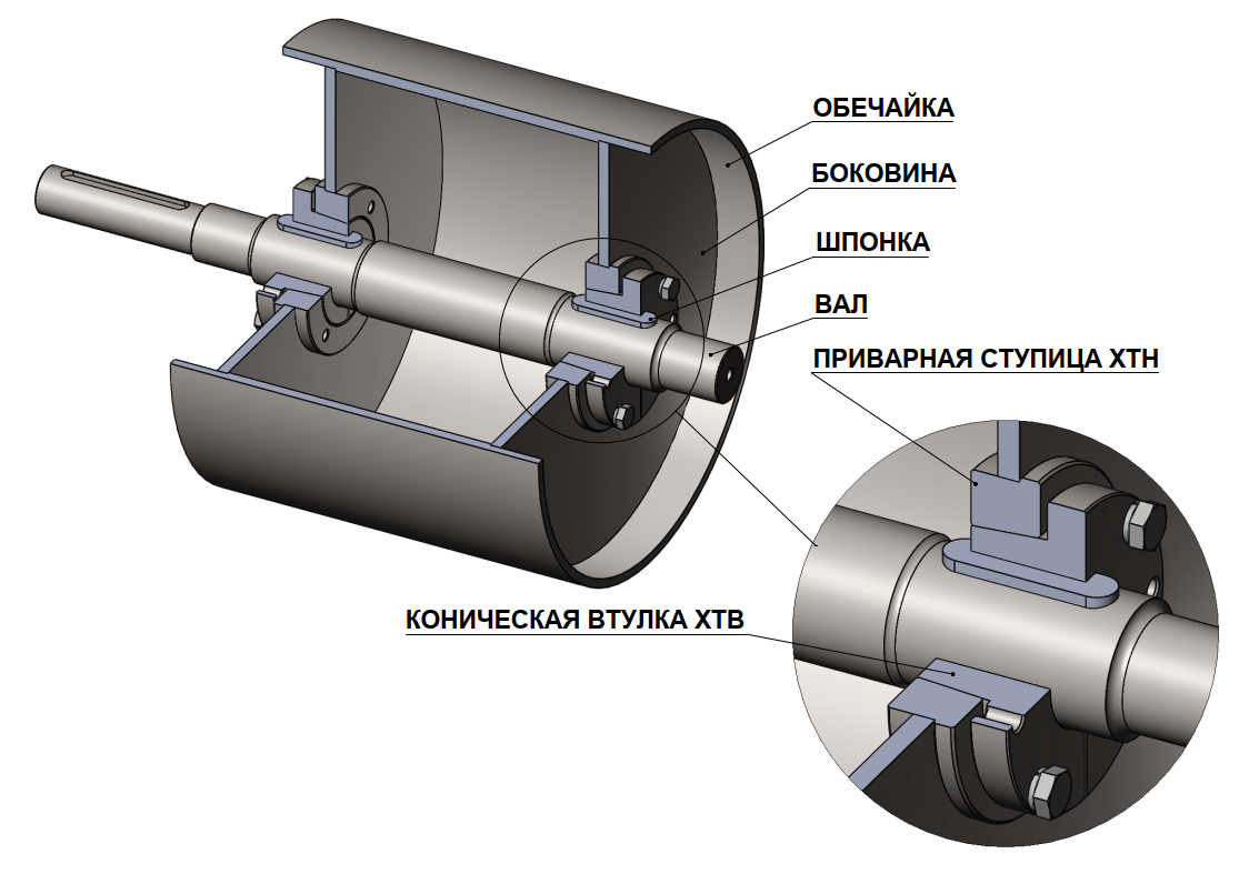 - Барабаны на конических втулках ХТ -оснащенные коническими втулками ХТ, представляют собой наиболее надежное и легкоремонтное решение для соединения вала с обечайкой барабана. Эта конструкция позволяет быстро разбирать барабан для проведения ремонта или замены отдельных элементов, таких как вал или обечайка. Барабаны с коническими втулками ХТ обладают высокой стойкостью к крутящим моментам, однако они являются самым дорогостоящим вариантом среди предлагаемых решений.